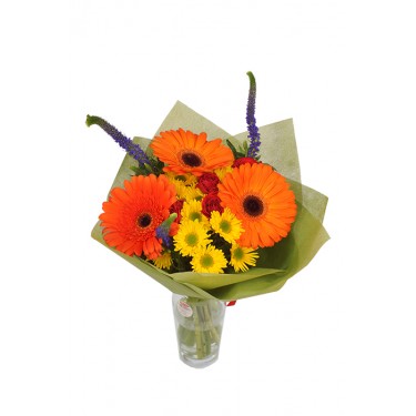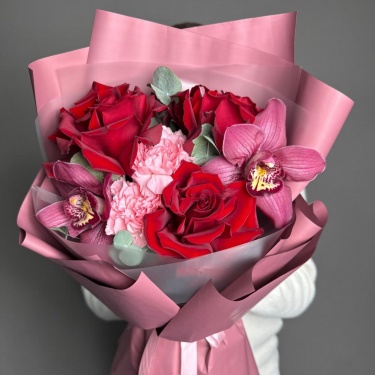 Авторский букет с бигуди-хризантемой, французскими розовыми розами, кустовыми розами и диантусами